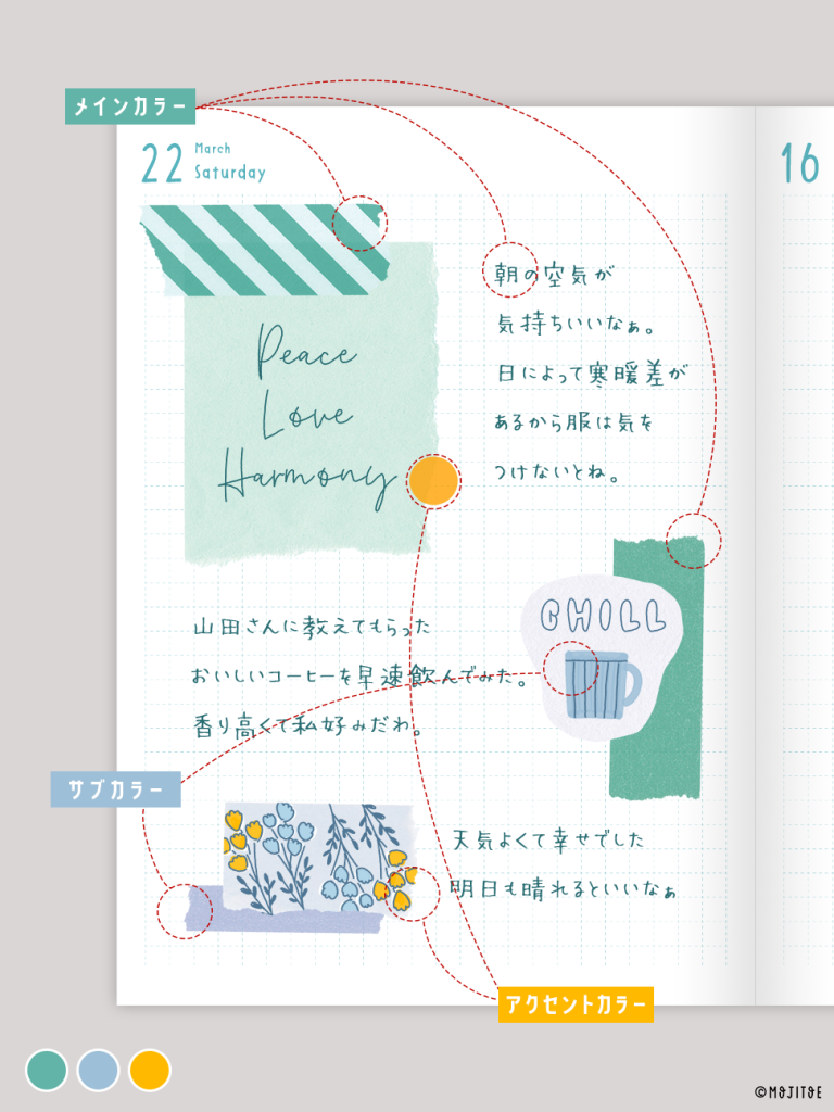 配色は、手帳デコの印象を左右する要素のひとつです。基本構成を押さえ、色の組み合わせを考えるだけで、手帳がぐっと素敵に仕上がります。