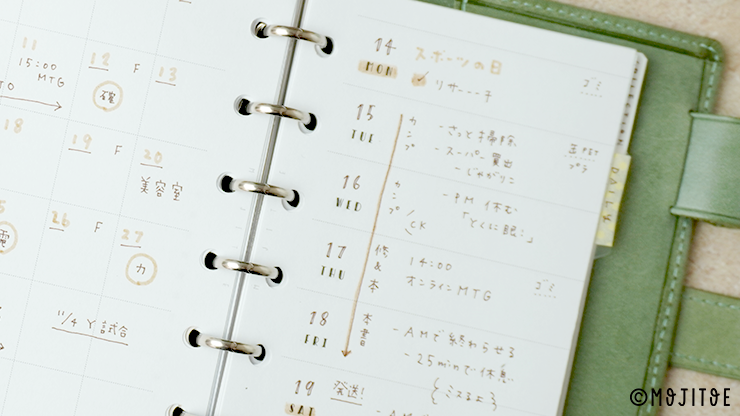 手帳で一番大切なのは、毎日の予定をしっかりと把握できることです。仕事やプライベートの予定、イベントなども記入して、頭のごちゃつきを整理。スマホよりも広く見渡せて、パソコンよりもサッと起動できるのが手帳のメリット。