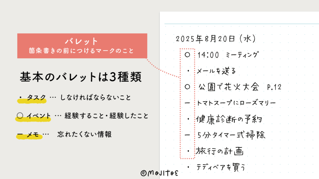 バレットを使えば、ノートに書き込む項目を一貫したルールで整理できます。
