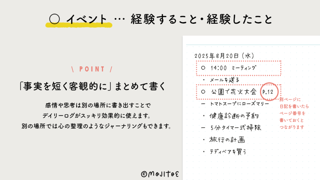 感情や思考について詳しく書きたいときは別の場所に書きましょう。