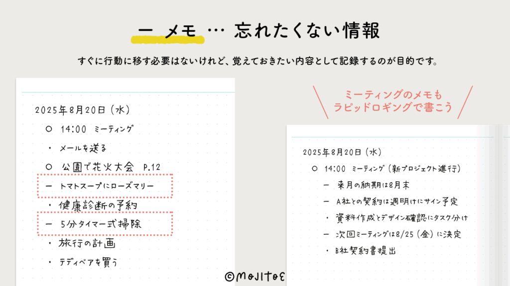 バレットジャーナルのラピッドロギングは、「情報を効率よく記録し、あとから振り返りやすくする」ことを目的としています。
