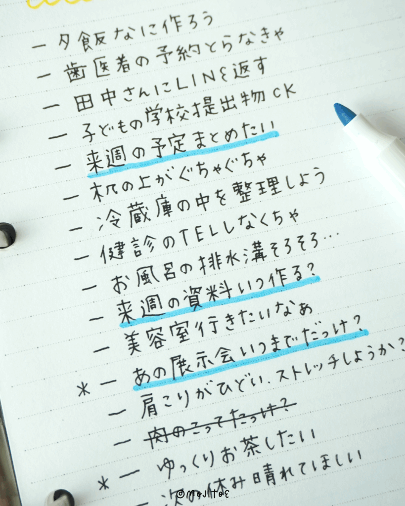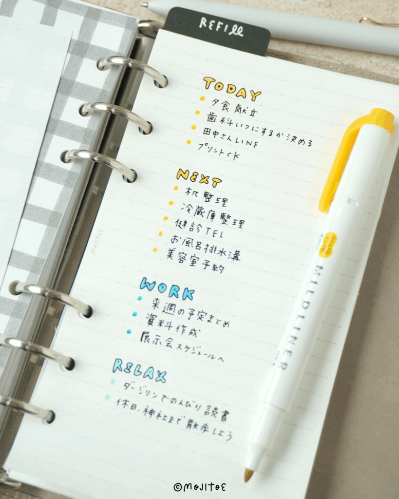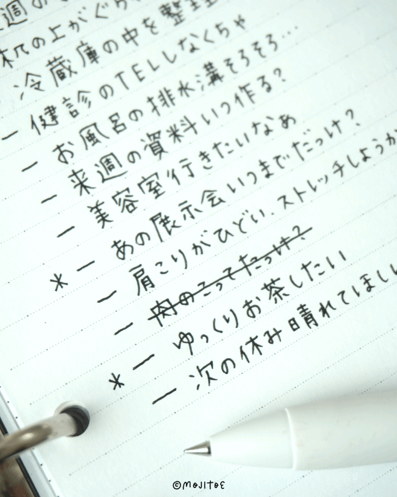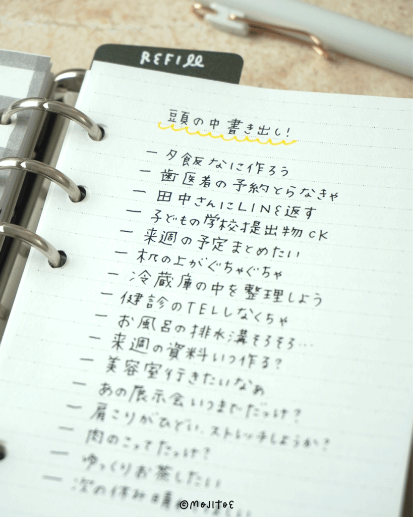 手帳に思いのまま書き出すことで、頭も心もスッキリ整理できて、気持ちも軽くなりますよ。