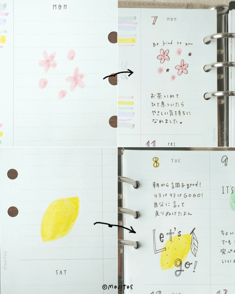 イラストの上にちょこっと英字でフレーズを入れたり、レモンのアレンジのように少し重ねて書くのもかわいいです。