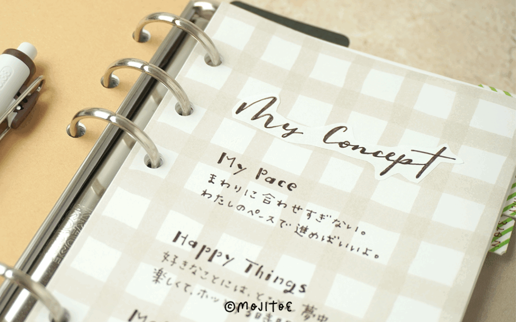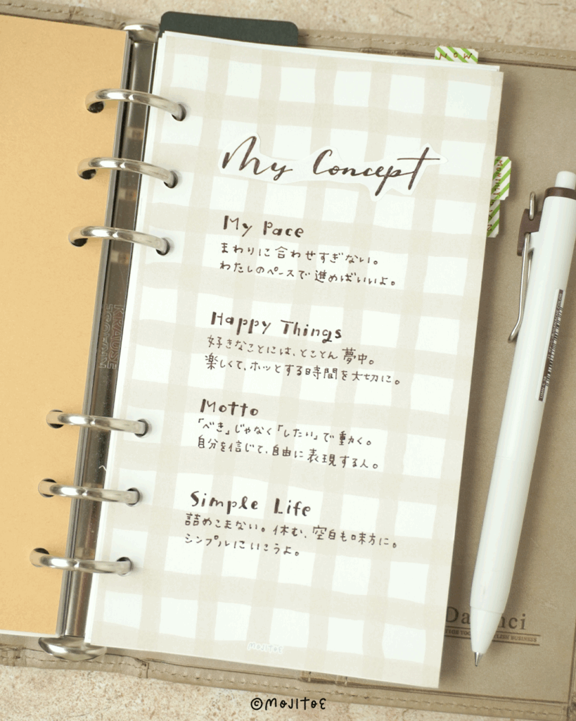 チェックの背景柄リフィルを使用。上部に先程のタイトルを貼り、下部ににコンセプトを書きます。背景柄リフィルならかんたんにかわいい&おしゃれなページが作れちゃいます。文字を書くので淡いカラーを選ぶのがオススメです。
