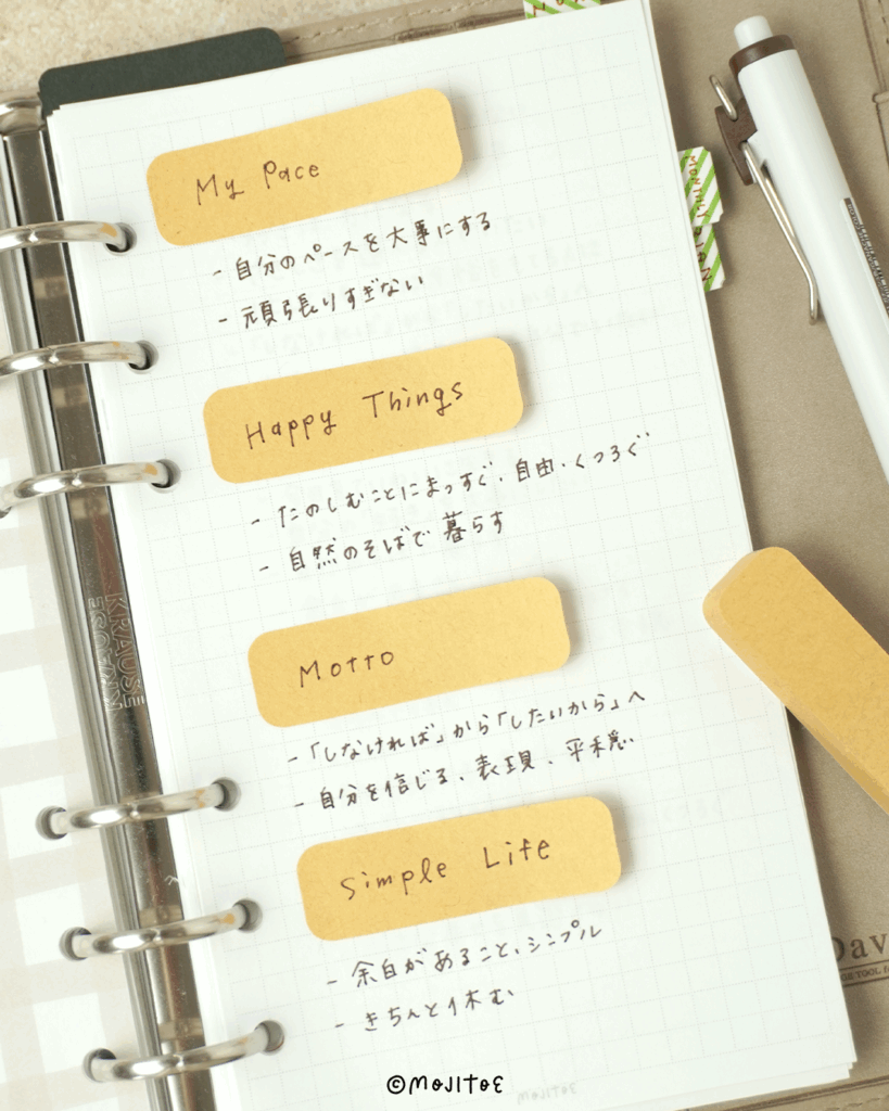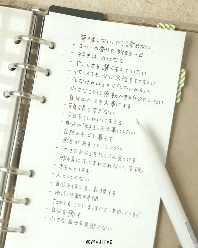 まずは手帳やノートなど書きやすい紙に、自分の理想や想い、価値観などを箇条書きで自由に書いてみてください。思いつくままでOK!