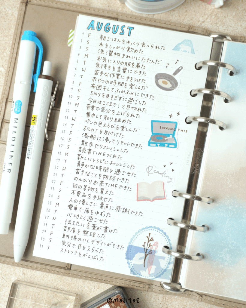 - 具体的に短く:例「音楽で気分を上げられた」「ペンの色選びを楽しんだ」書くのが負担にならないように、ちょっと物足りないくらいがちょうどいい♪