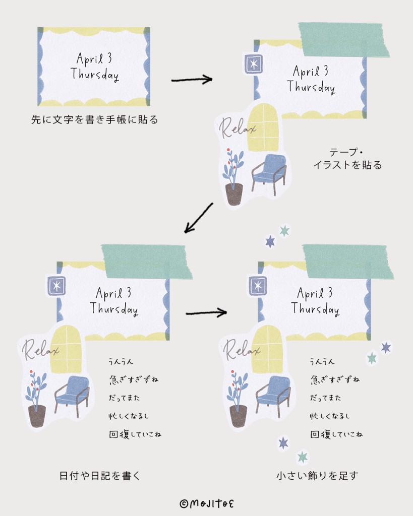 素材を使ってデコしてから、空いたところに日記を書く手順です。