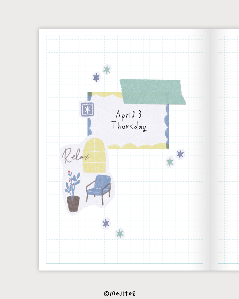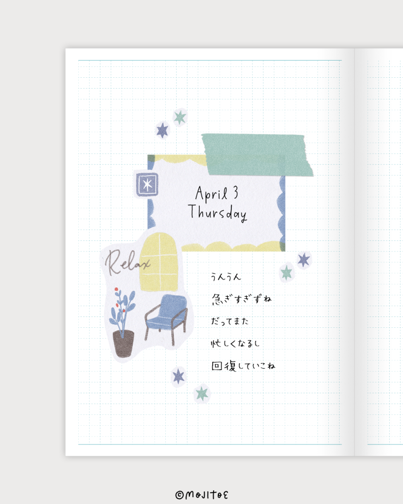 少ない素材でシンプルにまとめるときは、それぞれの素材のバランスに気をつけるのが大事です。手帳見本を参考に程よいバランスで素材を貼ってみてくださいね。