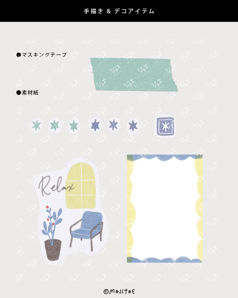 さり気なく重ねたマスキングテープや小さな素材が、絶妙なアクセントになっています。