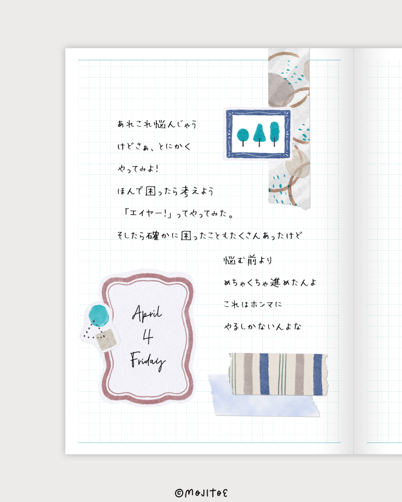 素材を使ってデコしてから、空いたところに日記を書く手順です。