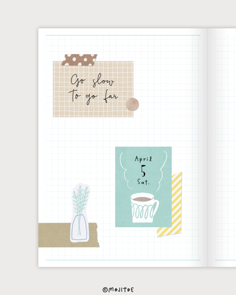 手帳デコをおしゃれにレイアウトするには、きっちりしすぎず少しずらすのがコツ。それぞれのデコ素材やページ全体に関しても「ちょっぴりずらす」という視点で観察&トライしてみてくださいね♪