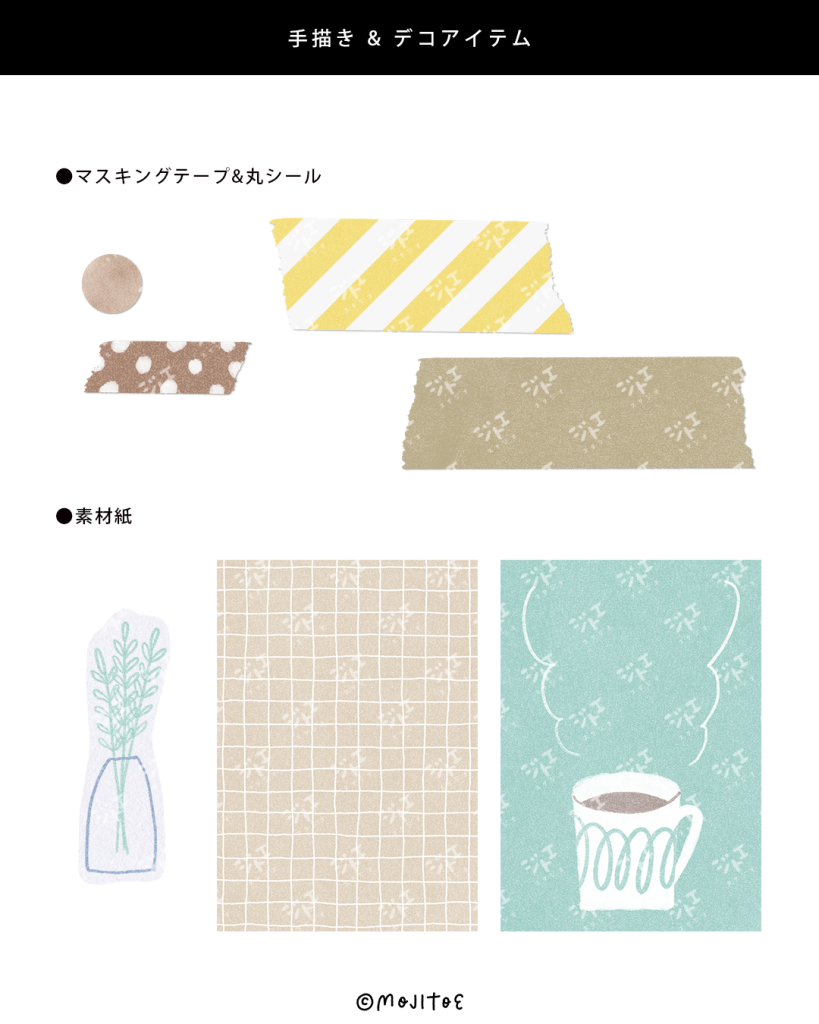 上記の素材に加えて、その他1週間分のデコ素材が入ったセット。色違いも掲載しているので、自分好みに変えて楽しむこともできます。