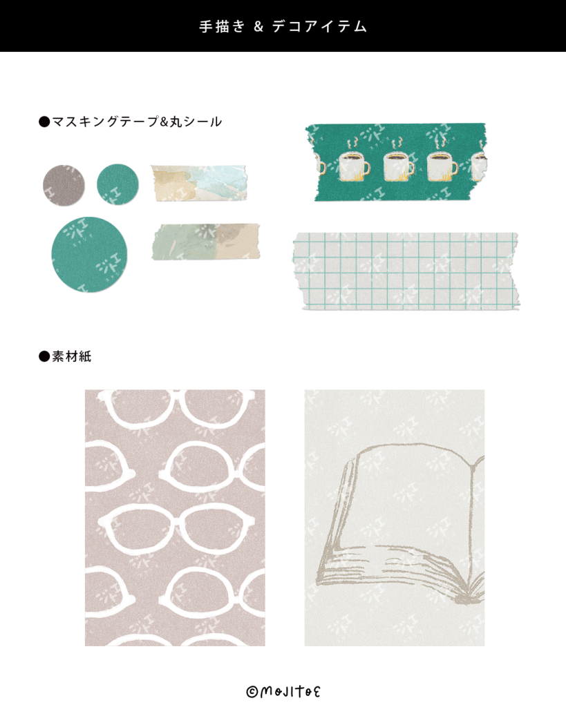 上記の素材に加えて、その他1週間分のデコ素材が入ったセット。色違いも掲載しているので、自分好みに変えて楽しむこともできます。
