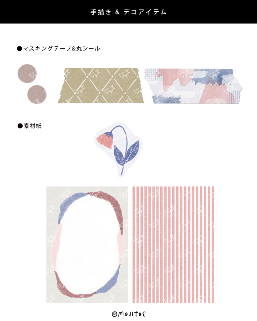 上記の素材に加えて、その他1週間分のデコ素材が入ったセット。色違いも掲載しているので、自分好みに変えて楽しむこともできます。