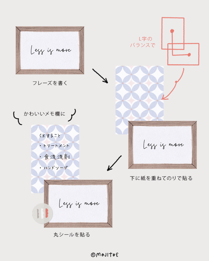 木枠のフレーム柄メモには好きな言葉をシンプルに書き、シックなおしゃれ感を演出。