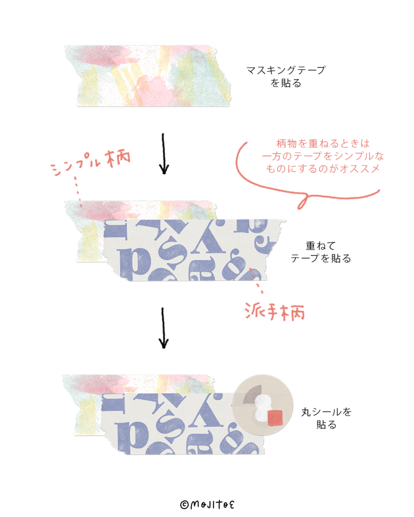 メモやテープの上に、最後の仕上げとして柄入りの丸シール(素材紙)をプラスすると、こなれた雰囲気が生まれます。