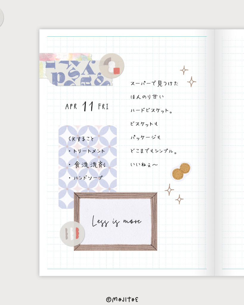 L字型に素材を配置し、右上に日記などを書きやすいスペースを確保しています。