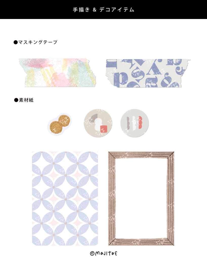 上記の素材に加えて、その他1週間分のデコ素材が入ったセット。色違いも掲載しているので、自分好みに変えて楽しむこともできます。