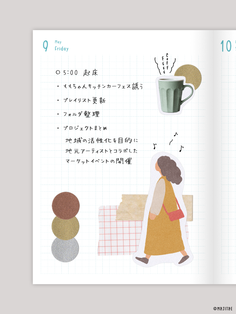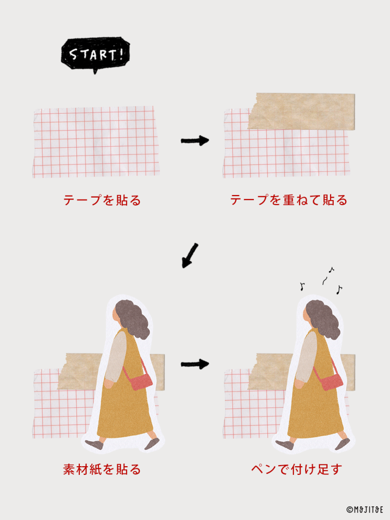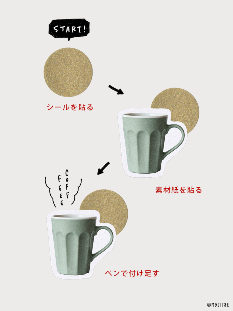 大きなものから順にデコするのがコツ。今回はマスキングテープと人物のデコ→コーヒーや丸シールのデコの順にするとバランスが取りやすいよ。