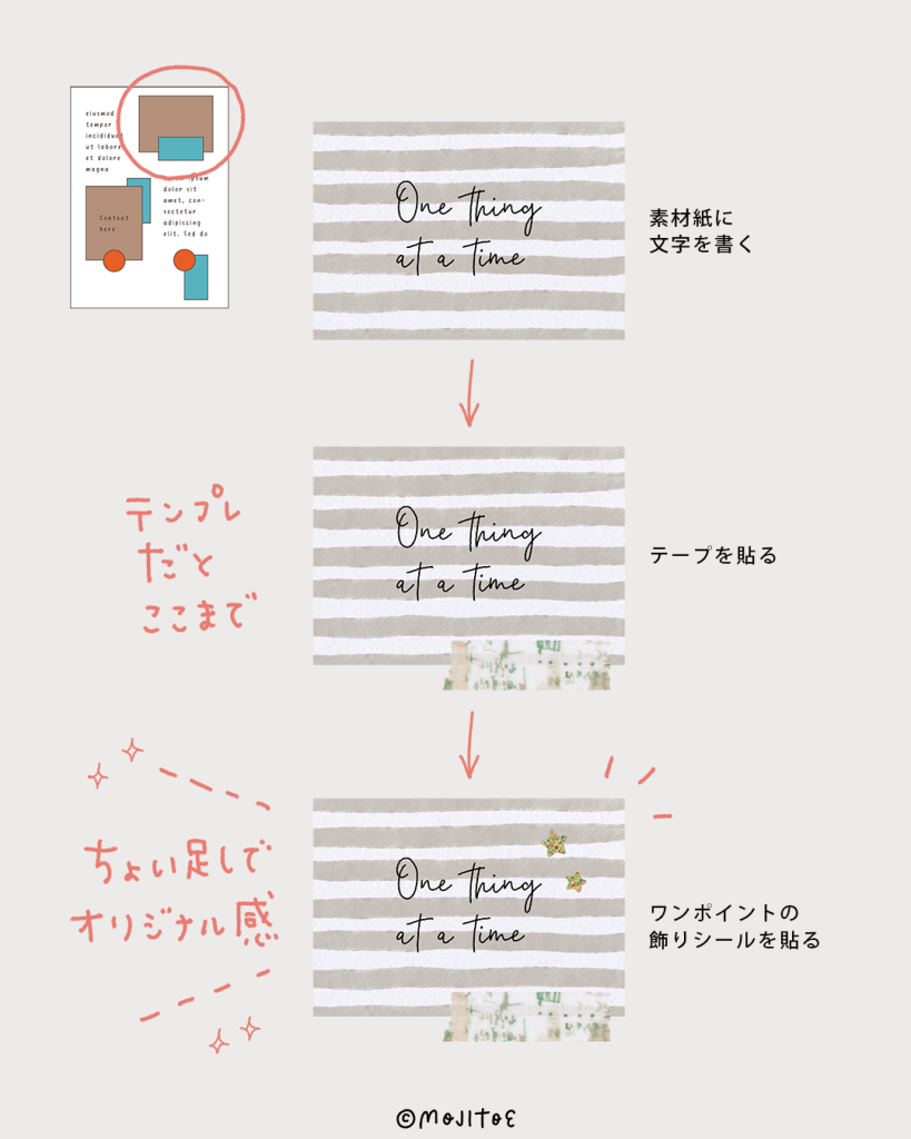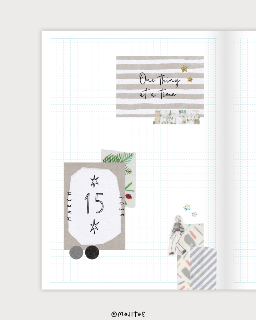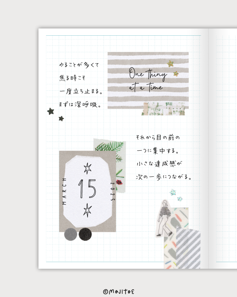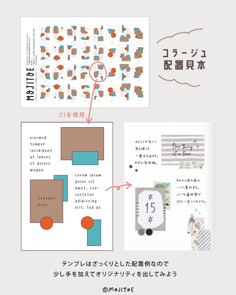MOJITOEオリジナルコラージュ手帳テンプレート。テンプレは便利だけど、ざっくりとした配置例なので「テンプレ感が抜けないなぁ」「物足りないなぁ」というときは少し手を加えてオリジナリティを出してみましょう。
