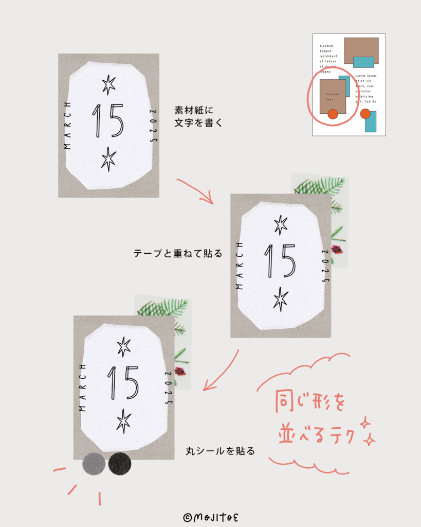 さらに下部に小さな丸シールを2つ貼ります。同じ形を並べるだけの簡単テクですが、ほんのひと工夫でこなれ感がアップ。