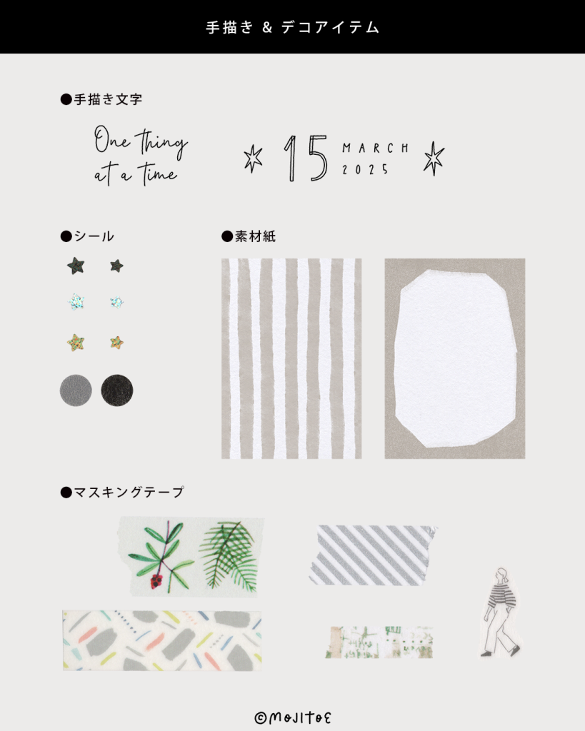 メインはグレイッシュなトーンですが、絵柄のテープや小さなシールにちょこっとだけ色を意識すると、派手すぎず程よいかわいさをプラスできます。