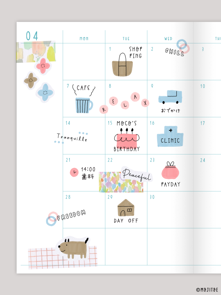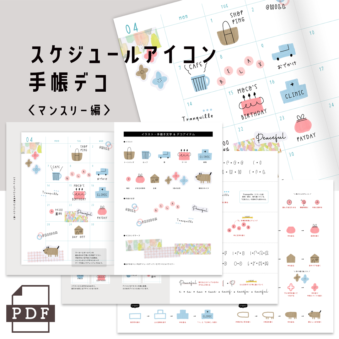 かわいい手帳イラストや、空間をあしらう手描き文字で、スケジュールページを楽しんでいただけるとうれしいです。