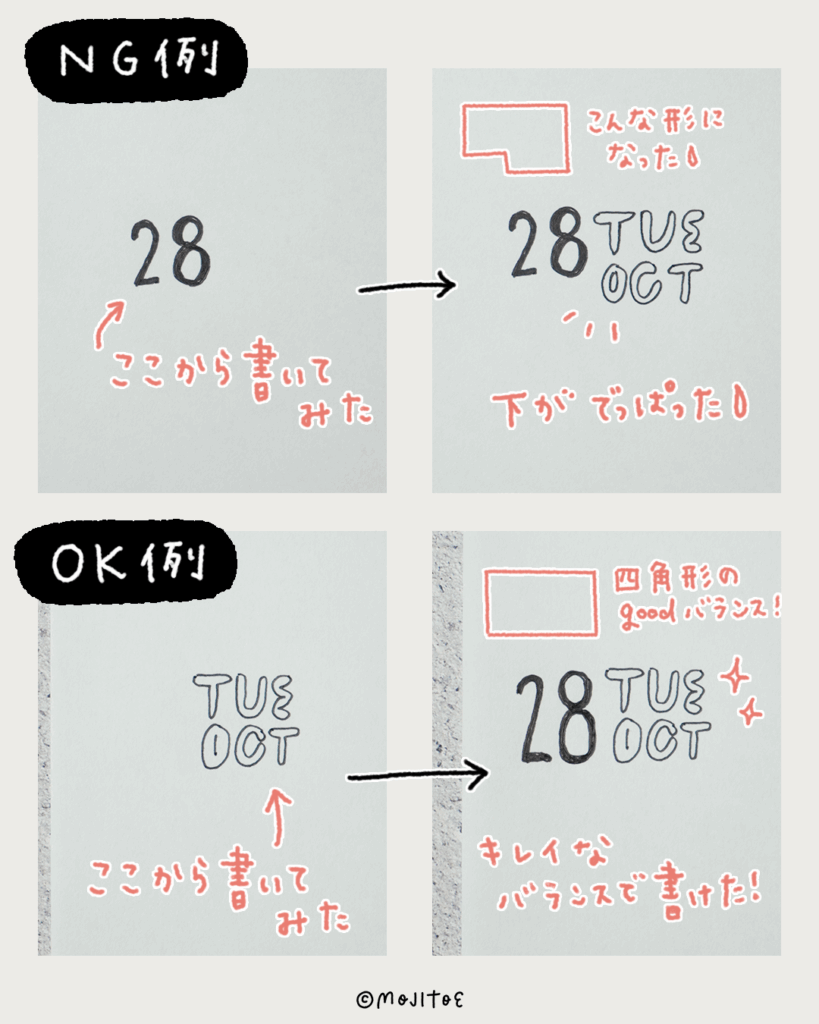 「曜日・月」→「日」の順に書くと、全体が四角形に収まってGOODなバランスになりました。