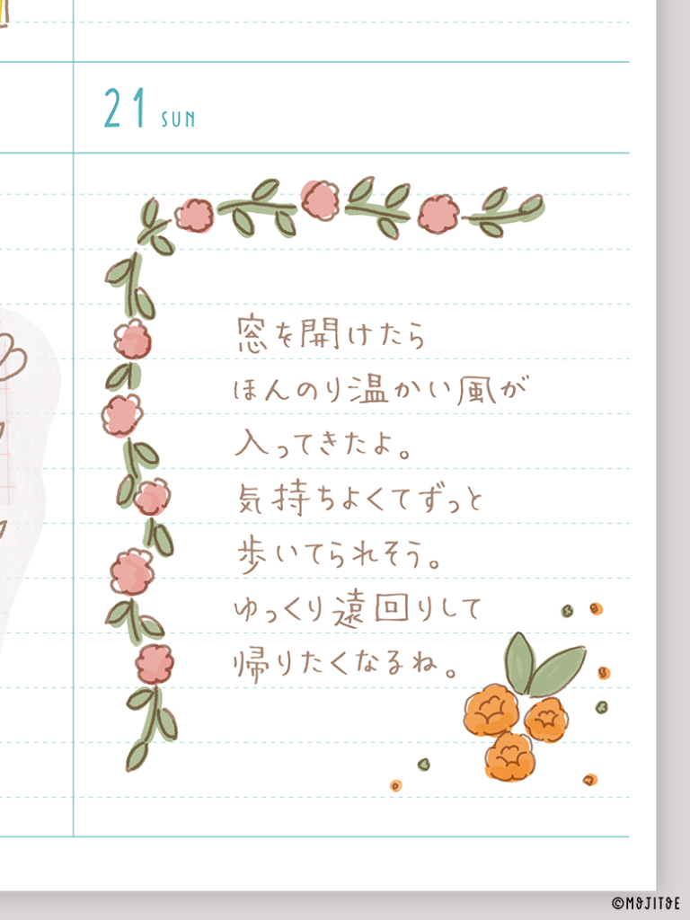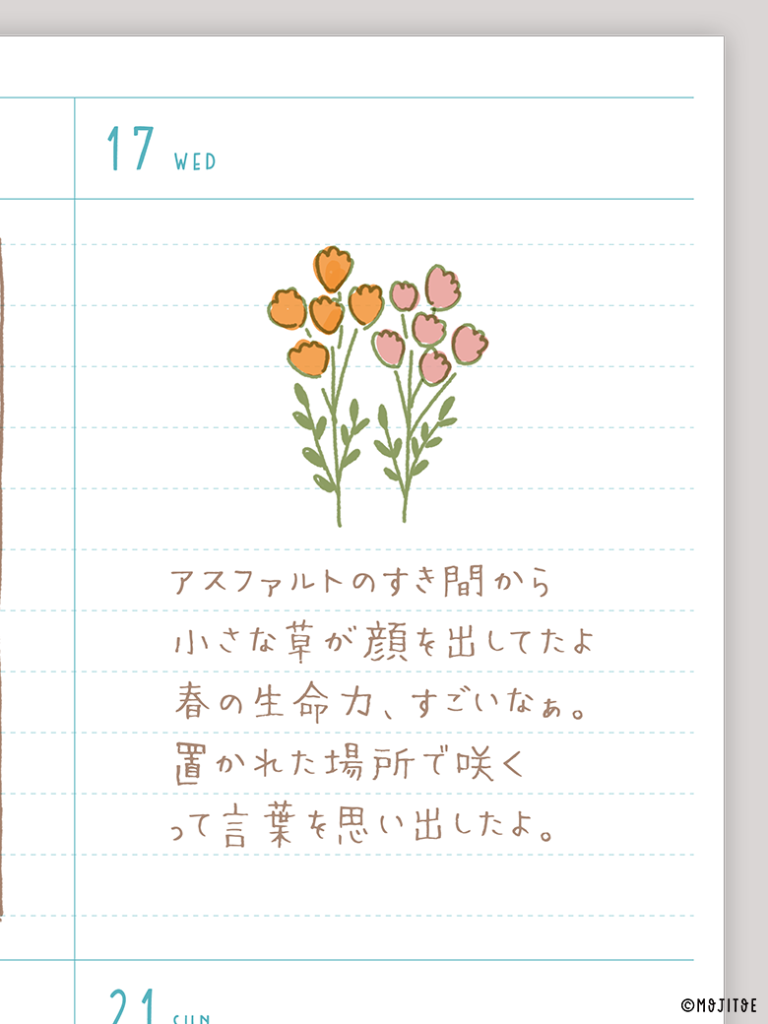 複数のお花イラストを中央に描き、その下に日記を書くレイアウト。