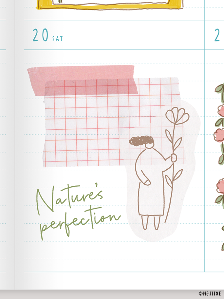 マスキングテープを重ね貼り。お花を持った人のイラストを添え、「Nature’s perfection」のようないつでも使えるハンドレタリングを足します。