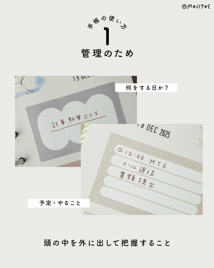 普段あまり意識していないことも多いのですが、手帳の1ページには、いくつもの使い方が混ざっています。