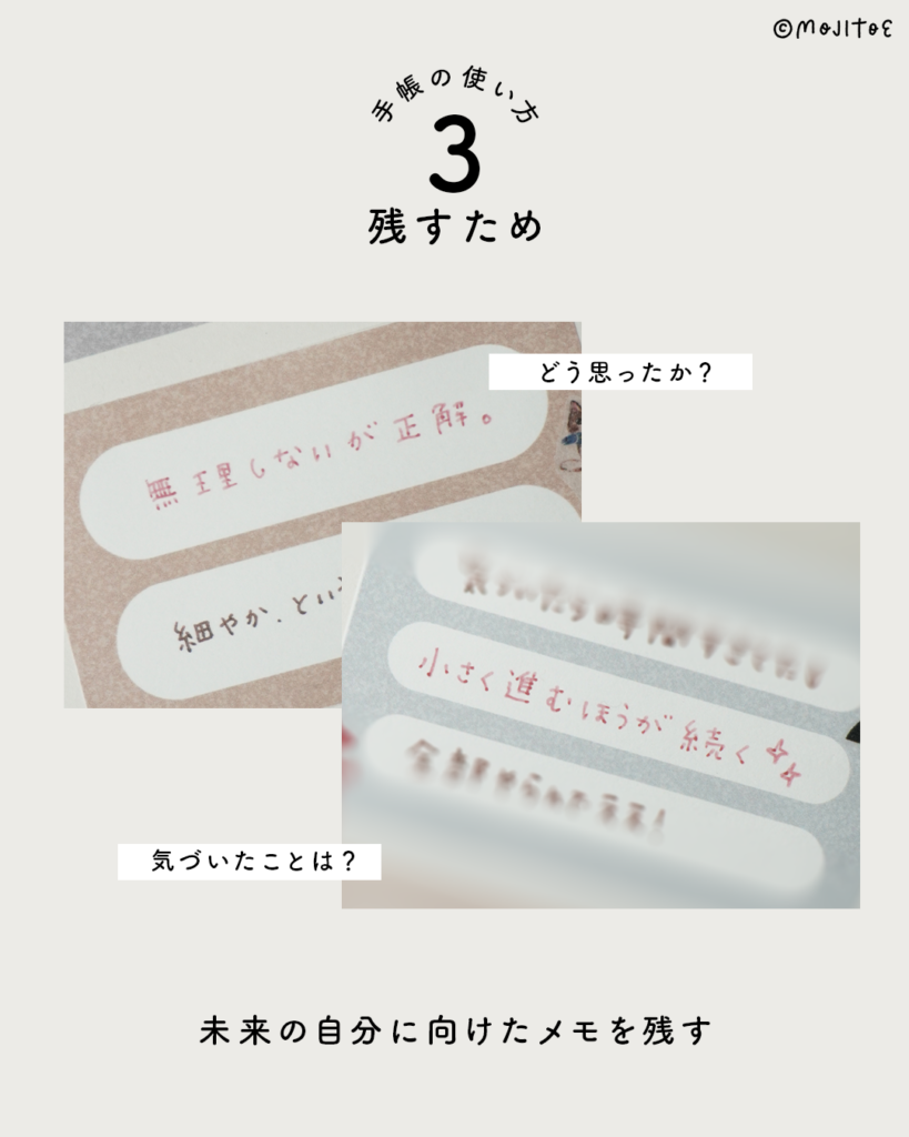 少し目立つように書いた言葉や、あとから見返しやすい形のメモ。