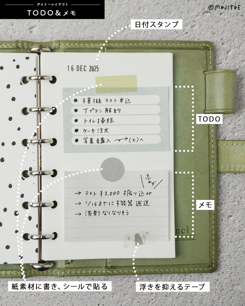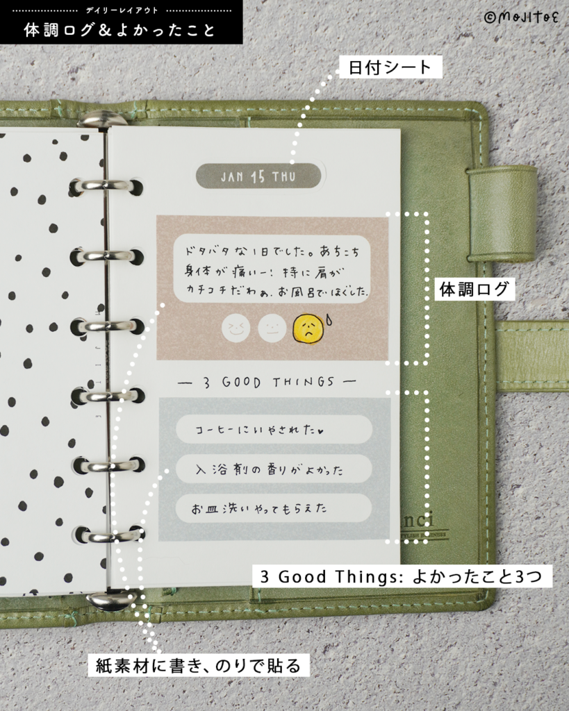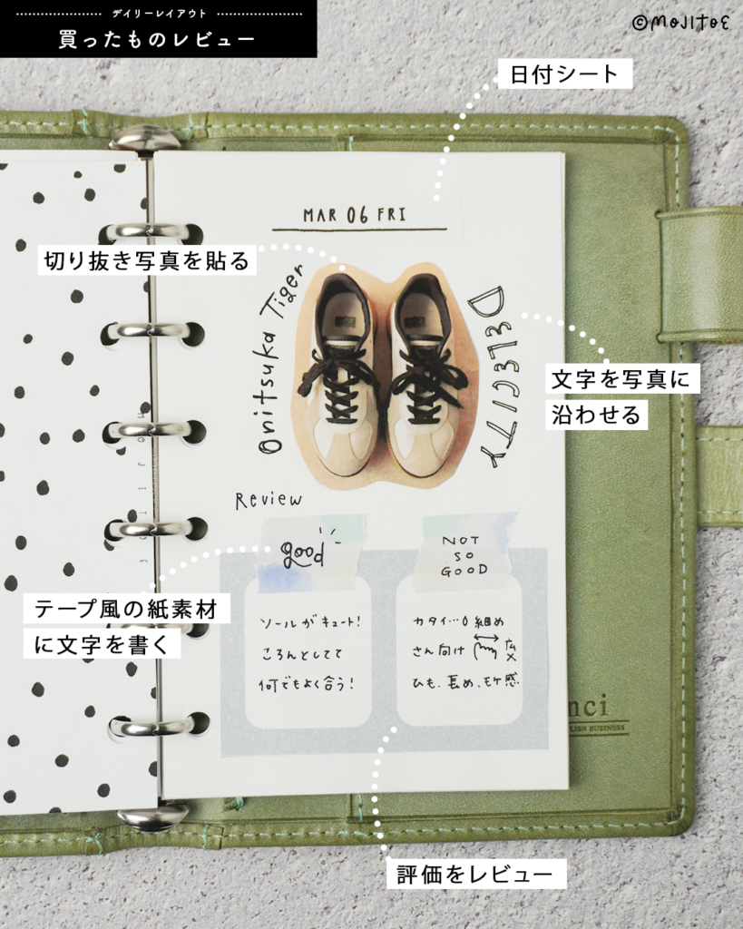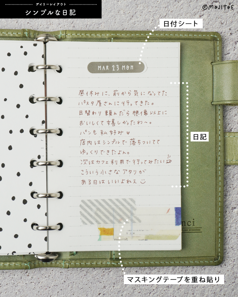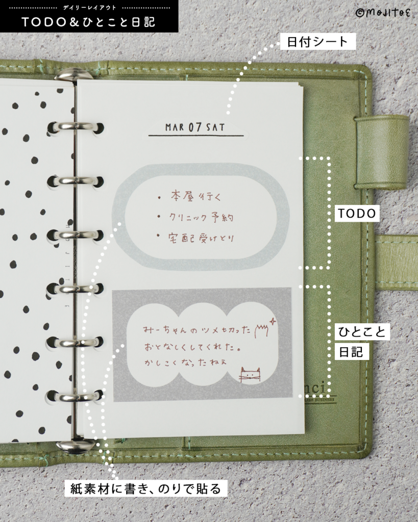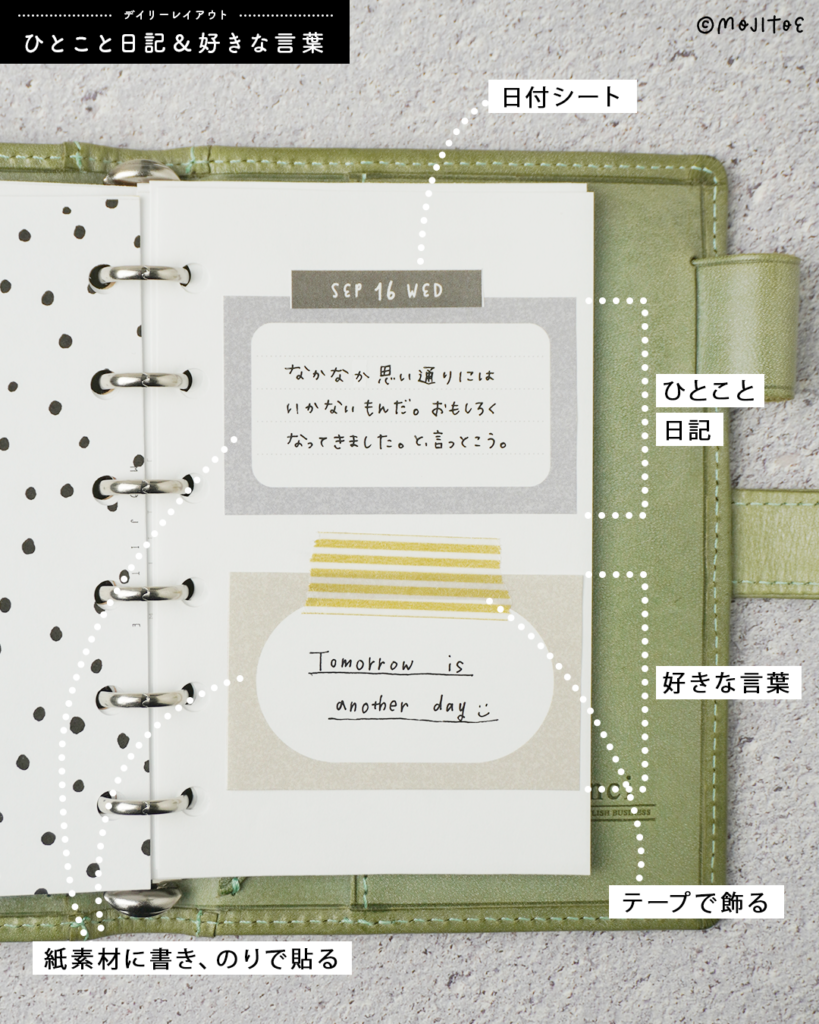 忙しい日でも書いたメモをサッと貼るだけで、手軽にページが完成するのがポイントです。