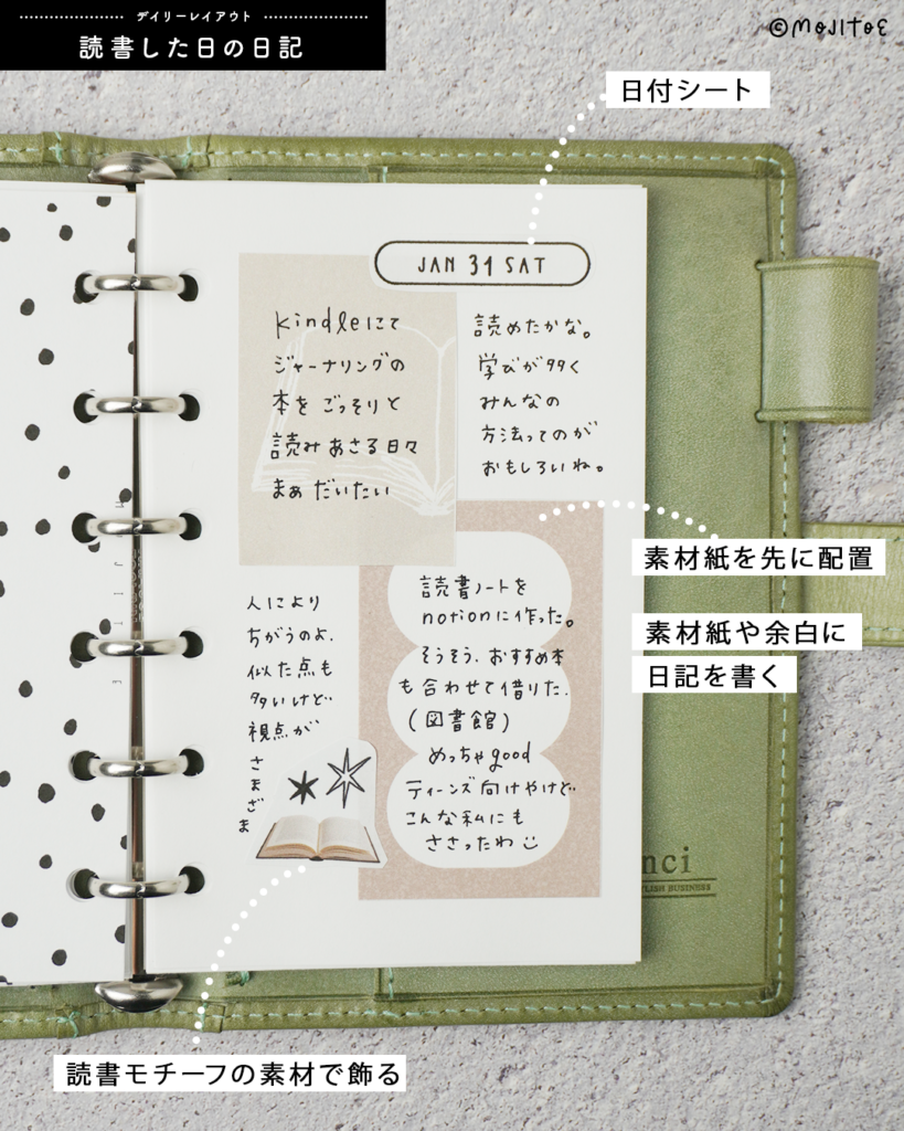 読書モチーフのメモやシールを使い、余白や素材紙に日記を書き込みます。