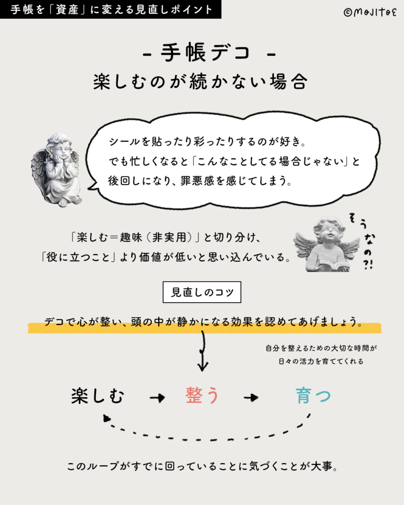 シールを貼ったり彩ったりするのが好き。でも忙しくなると「こんなことしてる場合じゃない」と後回しになり、罪悪感を感じてしまう。