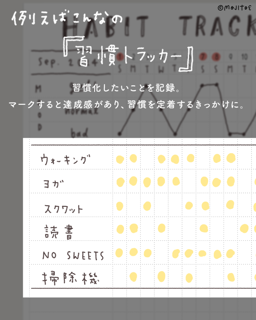 習慣にしたいことを並べて、できた日にマークをつけるだけ。