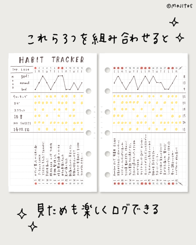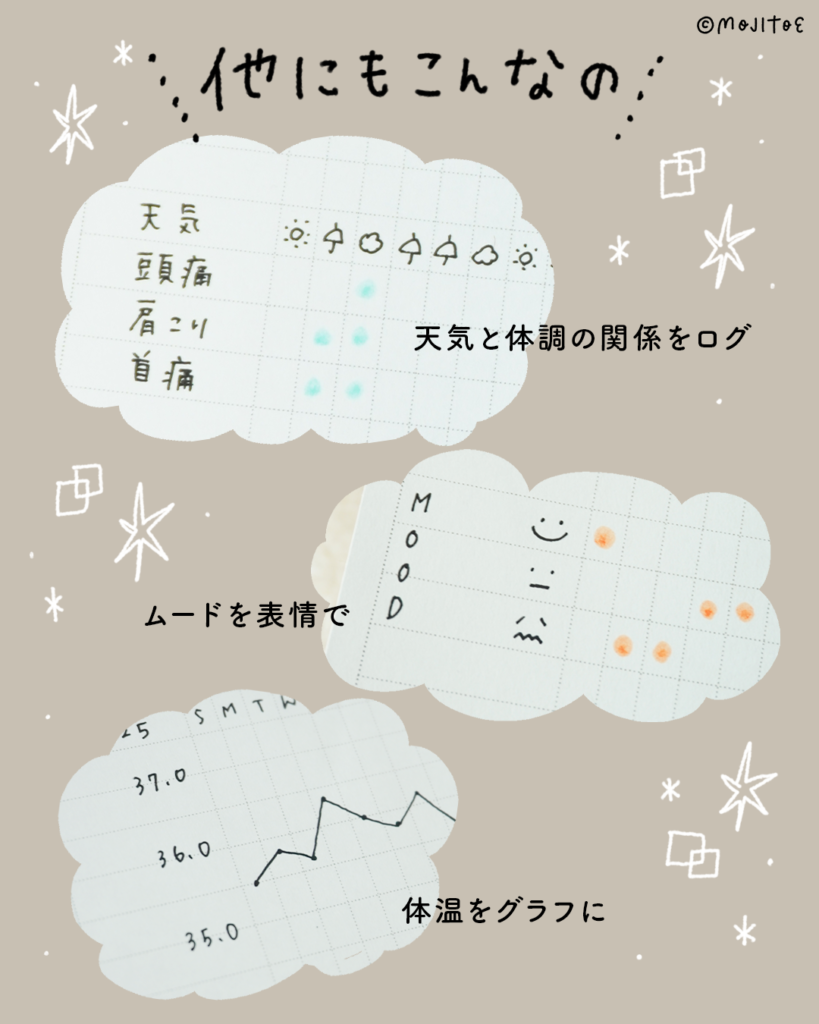 グラフとマークと1行日記。これら3つを組み合わせると、見た目も楽しくログできます。
