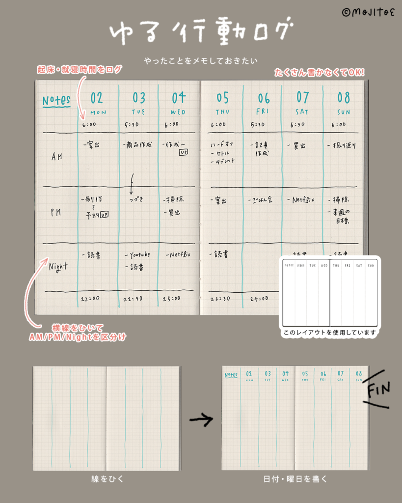 健康に気をつけたい人は、起床・就寝時間をメモするログもおすすめですよ◎