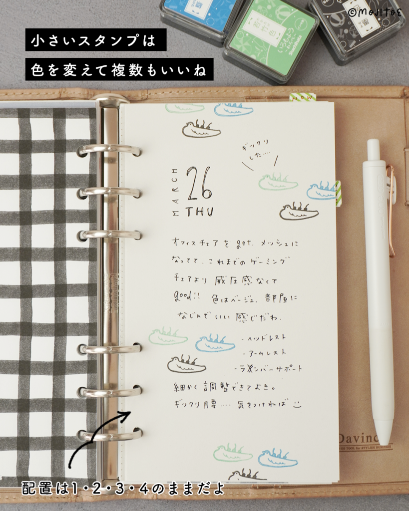 手帳のサイズによっては、インクの色を変えて複数押すのもおすすめ。