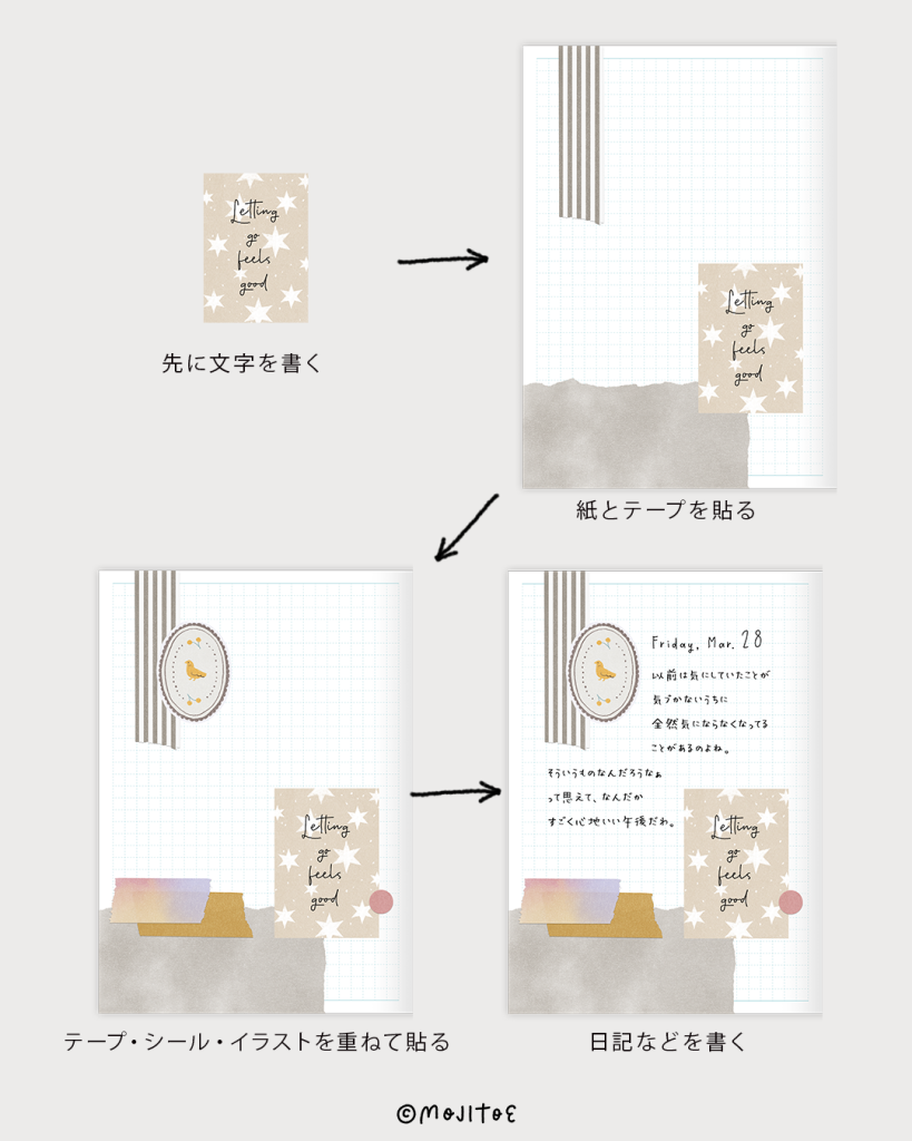 素材を使ってデコしてから、空いたところに日記を書く手順です。
