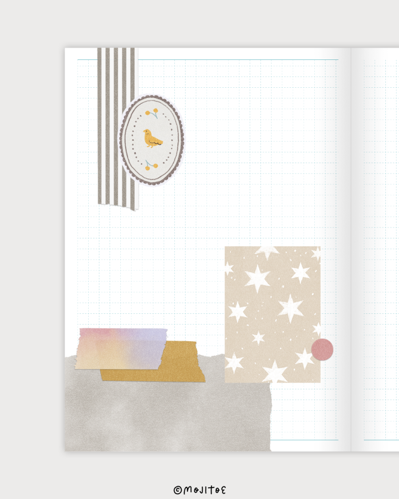左上のテープをページの端から伸ばすように貼ることで、外界への広がりを感じさせるデザインに仕上がります。