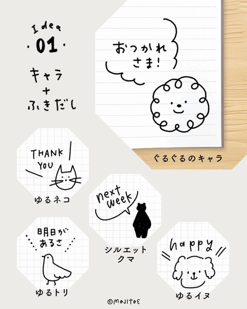 動物やゆるキャラを描いて、吹き出しの中にひと言メッセージを入れるアイデアです。