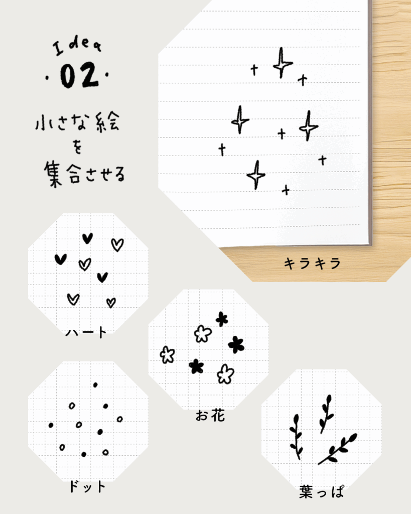 簡単な形を小さくたくさん並べるだけで、余白が一気に華やかになります。