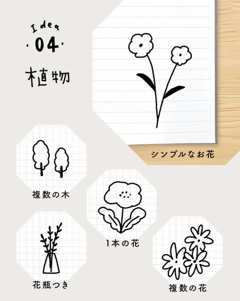 シンプルに茎と花だけ描いてもよし、花瓶や鉢をつければちょっとおしゃれな雰囲気に。