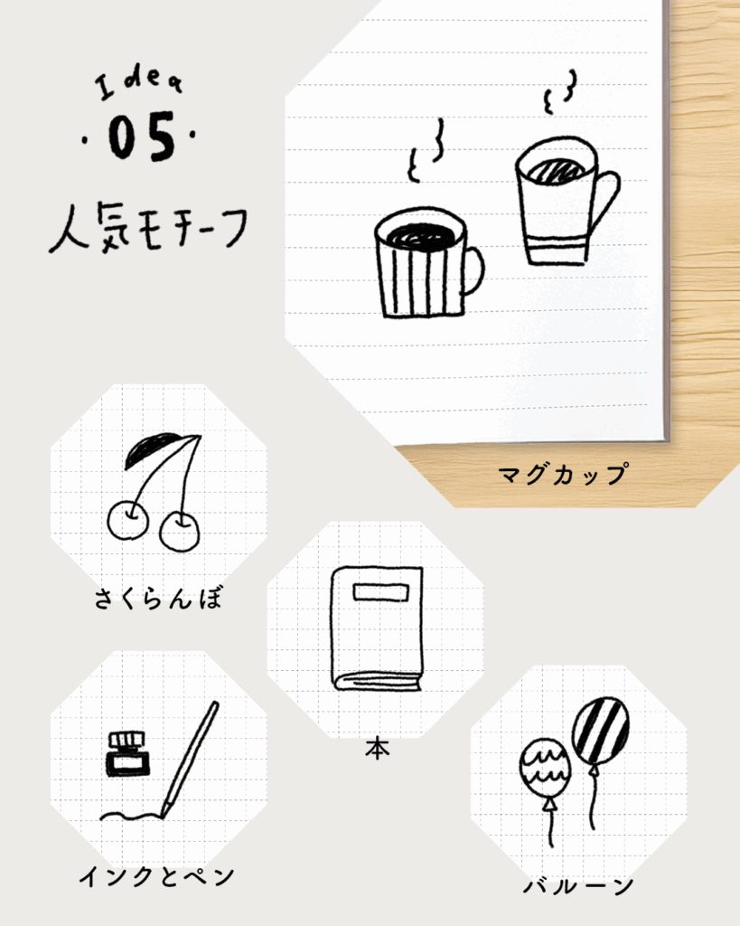 コーヒーカップや本、インクボトルなど、日常の中でよく目にするモチーフは、手帳イラストでも特に人気があります。